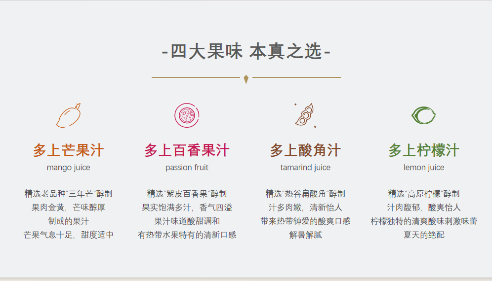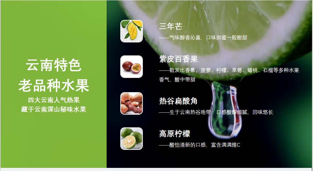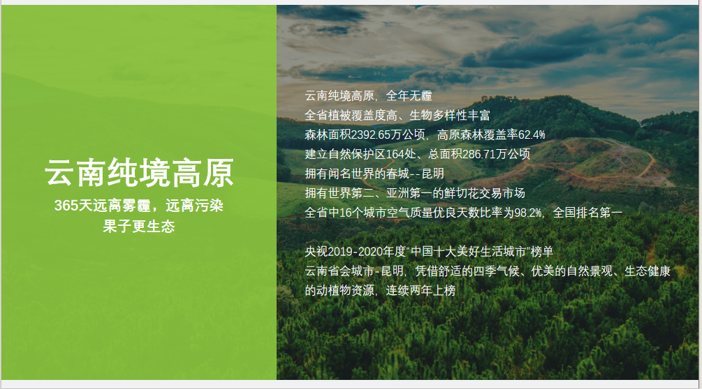 云南純境高原:365天遠(yuǎn)離霧霾,遠(yuǎn)離污染,果子更生態(tài) 高原陽光:12-14小時(shí)充足日照 果味更濃、更醇與厚 云南山谷工廠:工廠建在山谷里 新鮮采摘、新鮮榨汁 云南特色:老品種水果 四大云南人氣熱果 藏于云南深山秘味水果
